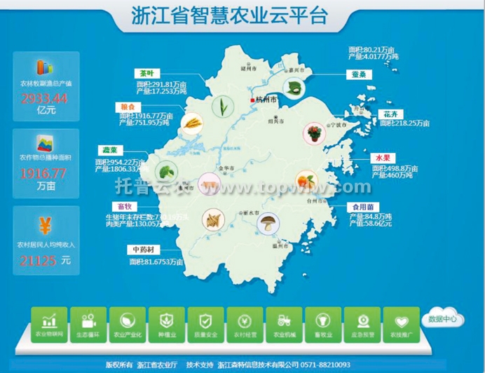 浙江省智慧農(nóng)業(yè)云平臺由浙江托普云農(nóng)科技股份有限公司全資子公司杭州森特科技研發(fā),借助新一代物聯(lián)網(wǎng)、大數(shù)據(jù)、3S等信息化技術(shù)整合省市縣各級涉農(nóng)資源,以頂層設(shè)計方式建成“一個平臺一個中心N個應(yīng)用”。浙江省智慧農(nóng)業(yè)云平臺,通過匯聚農(nóng)業(yè)產(chǎn)業(yè)、農(nóng)業(yè)“兩區(qū)”、物聯(lián)網(wǎng)、植保、農(nóng)機、畜牧、農(nóng)資、農(nóng)經(jīng)、科教等各級農(nóng)業(yè)業(yè)務(wù)應(yīng)用及數(shù)據(jù),形成“大農(nóng)業(yè)”數(shù)據(jù)中心。在構(gòu)建互聯(lián)共享的“互聯(lián)網(wǎng)+農(nóng)業(yè)”信息服務(wù)體系基礎(chǔ)上,最終實現(xiàn)科學(xué)指導(dǎo)農(nóng)業(yè)生產(chǎn)經(jīng)營管理、政府決策監(jiān)管和社會公眾服務(wù)。