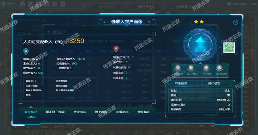 ? ? ? ? 構(gòu)建防返貧監(jiān)測一張圖,通過天地圖形式,對幫扶情況基本信息、致貧原因、兩不愁三保障、收支情況、幫扶措施、幫扶記錄等信息進(jìn)行可視化分析。并利用低收入農(nóng)戶畫像管理技術(shù),賦予農(nóng)戶每人“一碼”,以三色碼原則分別對應(yīng)不同狀態(tài)的低收入人群。