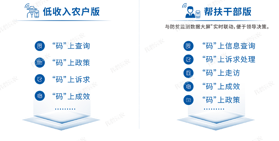 本方案利用大數(shù)據(jù)、區(qū)塊鏈等數(shù)字技術(shù),以早發(fā)現(xiàn)、早干預(yù)、早幫扶為基本準(zhǔn)則,開發(fā)了幫扶數(shù)據(jù)管理系統(tǒng)、“防貧監(jiān)測一張圖”、掌上應(yīng)用、防貧監(jiān)測預(yù)警、防貧一件事等功能,對低收入農(nóng)戶群體進(jìn)行摸底,跟蹤單戶收入變化以及對“兩不愁三保障”等政策扶貧的鞏固情況,旨在實(shí)現(xiàn)返貧監(jiān)測預(yù)警,探索出一條從“輸血”到“造血”轉(zhuǎn)變的路徑。