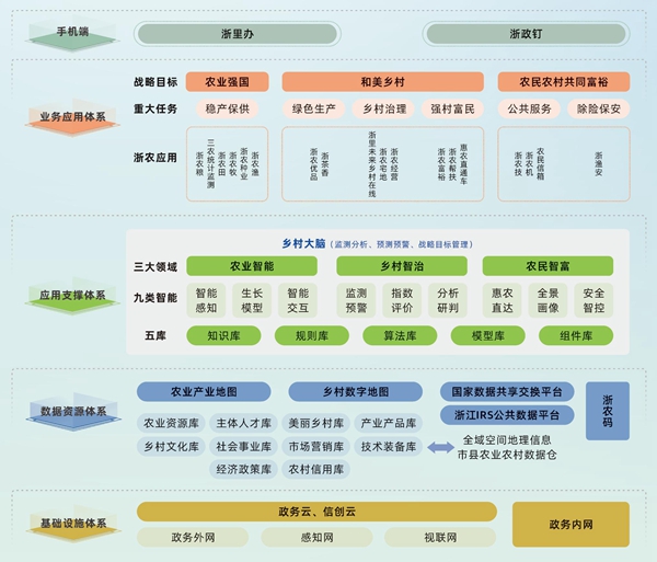 浙江省農(nóng)業(yè)農(nóng)村廳圍繞省委數(shù)字化改革決策部署,聚焦大腦監(jiān)測分析評價、預測預警和戰(zhàn)略目標管理能力的新目標,大力推進”浙江鄉(xiāng)村大腦 +浙農(nóng)系列應用”體系建設(shè),迭代形成以”11153″核心構(gòu)架為支撐的”浙江鄉(xiāng)村大腦”(1個數(shù)據(jù)倉,1張全域地理信息圖,1個”浙農(nóng)碼”,5個庫為知識庫、規(guī)則庫、算法庫、模型庫和組件庫,3領(lǐng)域能力為農(nóng)業(yè)智能、鄉(xiāng)村智治、農(nóng)民智富),按照“一表一圖N清單”的方法,開發(fā)建設(shè)9個智能模塊,以數(shù)字技術(shù)助力農(nóng)業(yè)農(nóng)村現(xiàn)代化、鄉(xiāng)村振興和農(nóng)民農(nóng)村共同富裕。目前,”浙江鄉(xiāng)村大腦”已實現(xiàn)省市縣三級貫通。